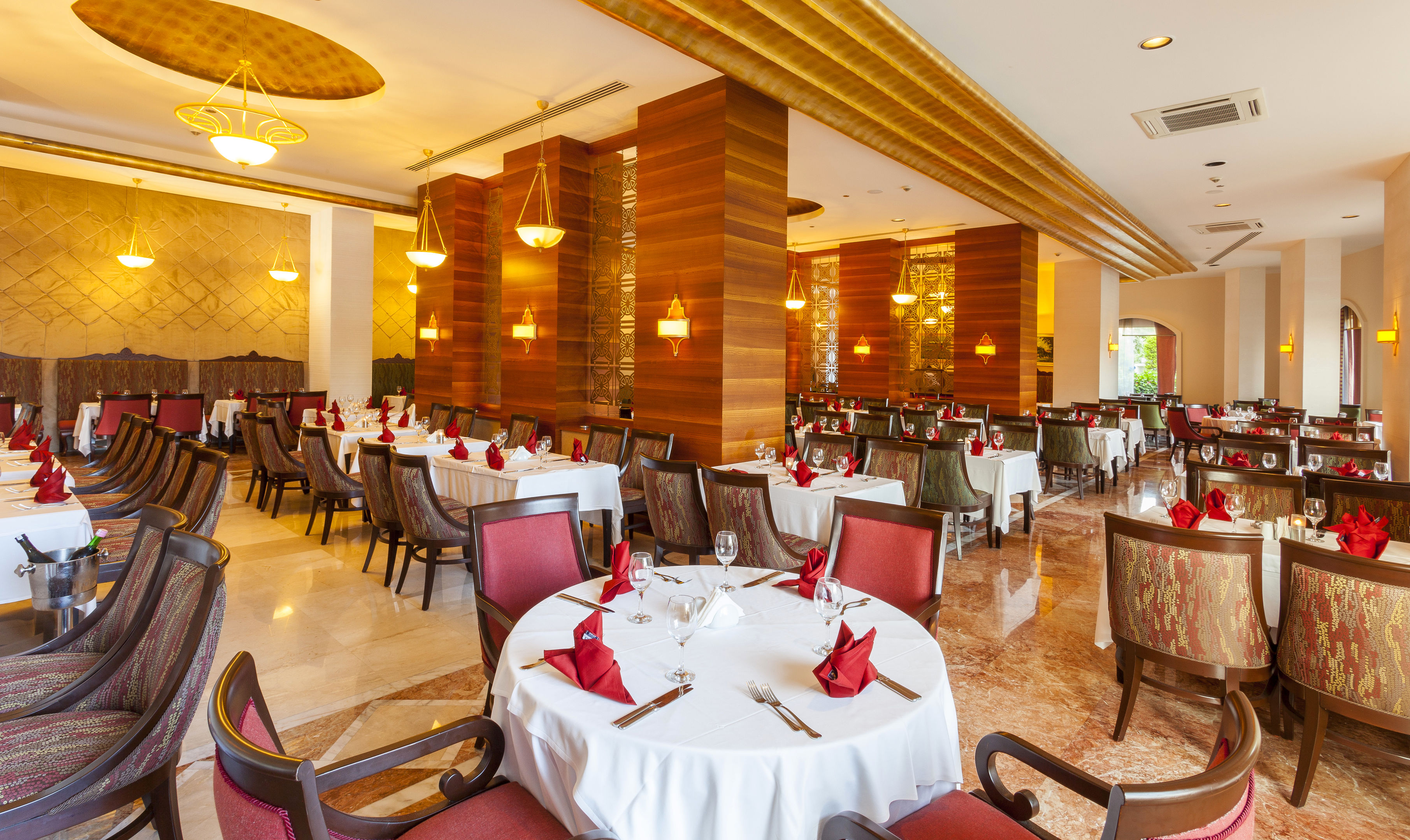 Összesen 322 szobát kínálnak a vendégeknek. A vendégek egy előcsarnokba érkeznek, ahol recepció (check-in/-out) várja őket. A legtöbb emelet lifttel is elérhető. A vendégek rendelkezésére áll egy csomagmegőrző is. A közösségi helyiségekben vezeték néküli internet-hozzáférés (WiFi) áll rendelkezésre (díjmentesen). A kirándulások foglalásánál a tourdesk nyújt segtséget. A vendégeket egy étterem, egy bár és egy strandbár várja. Vásárlási lehetőséget kínál egy élelmiszerbolt, valamint további butikok. A szállás területéhez tartozik egy kert is. A hotelben található továbbá egy könyvtár. Elérhető szolgáltatások továbbá: több nyelven beszélő személyzet, 24 órás biztonsági felügyelet és bébiszitter-szolgáltatás. Az üzleti tevékenység és kommunikáció maximális támogatása érdekében rendelkezésre áll egy faxgép is. Előadások, megbeszélések és konferenciák lebonyolítására 2 konferenciaterem áll rendelkezésre.